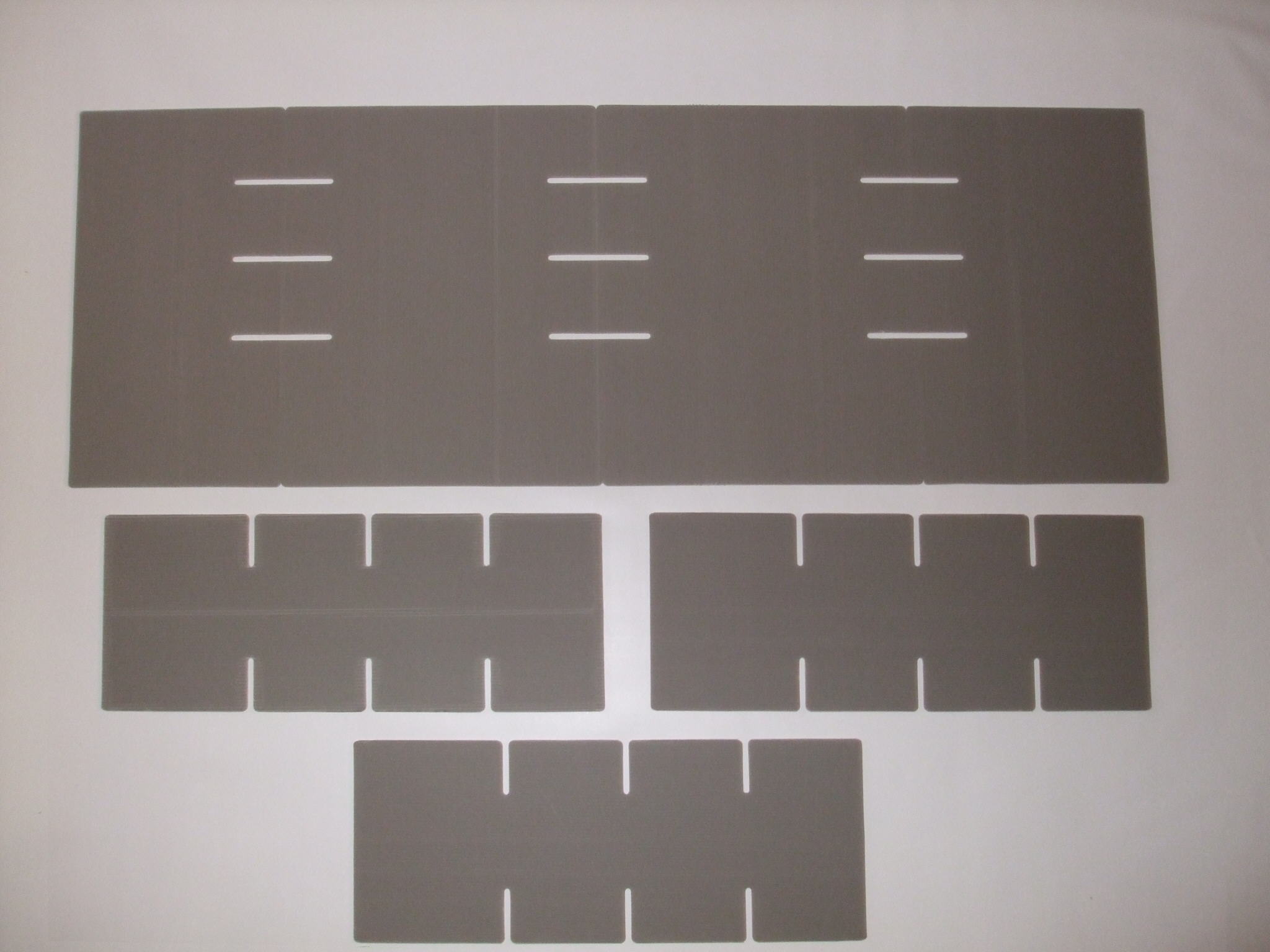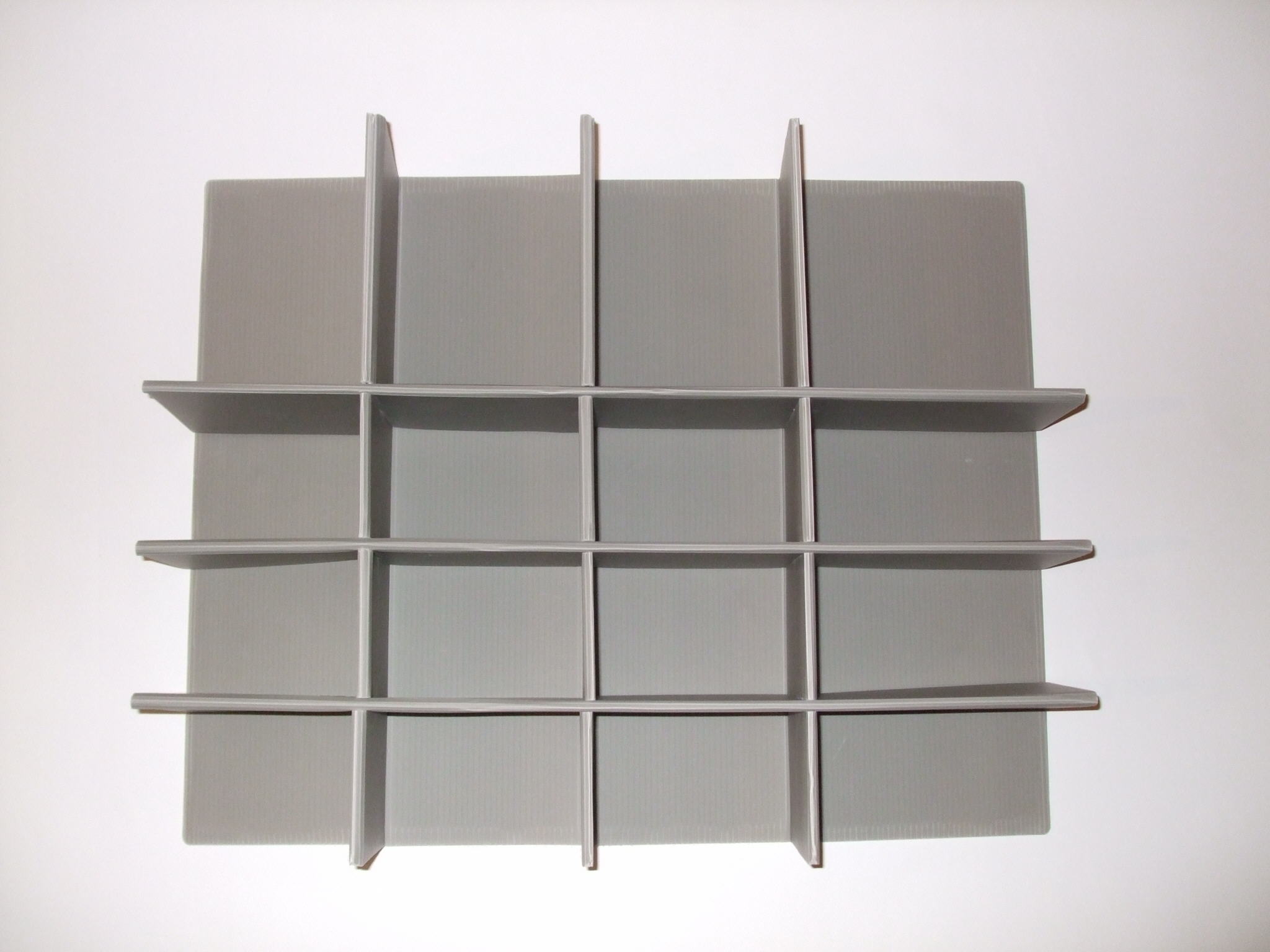 Die Box besteht aus 5 Einzelteilen, 3 teilige Aufteilung / Fächer, 1 Korpus / Gehäuse, 1 Deckel / Rückwand